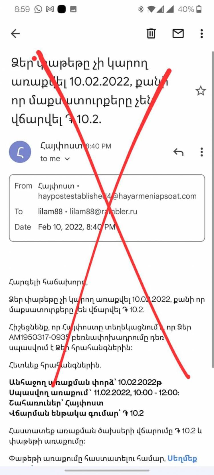 «Ժող ջան, Հայփոստի անունից կեղծ նամակներ են գալիս։ Զգուշացեք»: