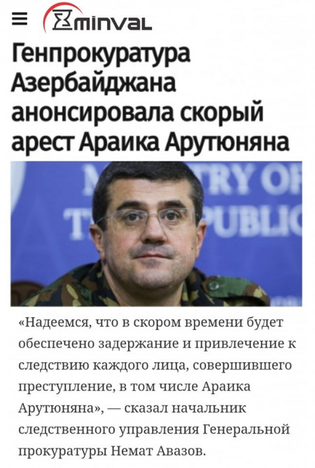 Ադրբեջանի գլխավոր դատախազության քննչական վարչության պետն այսօրվա ասուլիսի ժամանակ հայտարարել է, որ «մոտակա ժամանակներս ձերբակալվելու և պատասխանատվության է ենթարկվելու ոչ միայն Արայիկ Հարությունյանը, այլ նաև "հանցագործություն կատարած" բոլոր անձինք...