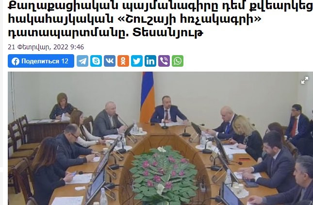 Թուրքահպատակը պոզով-պոչովա լինու՞մ... 21 Փետրվար, 2022 19:02 Поделиться Թուրքահպատակը պոզով-պոչովա լինու՞մ... Քպ-ն մերժեց «Հայաստան դաշինքի» ներկայացրած՝ «Շուշիի հռչակագրի» դեմ հայտարարության տեքստը... Մնումա մի հատ էլ Թուրքիայի ու Ադրբեջանի նման վավերացնի ու վերջ... Աննա Դեմիրճյանի ֆեյսբուքյան էջից