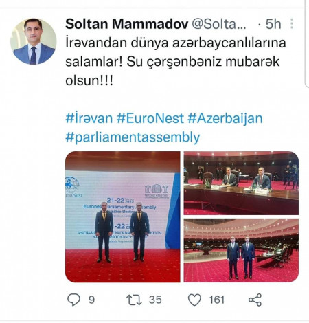Բաքվի բռնապետի խորհրդարանի՝ Երևան ժամանած ներկայացուցիչն այնքան համարձակություն ունի, որ «Արցախը Ադրբեջան է!» ետնանկարով իր թվիթերյան օգտահաշվի միջոցով մեր մայրաքաղաքից ողջույններ է հղում աշխարհի ադրբեջանցիներին և շնորհավորում նրանց «Ջրի չորեքշաբթին»։