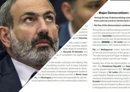 Զեկույցում Հայաստանը ներկայացված է այն երկրների շարքում, որտեղ ոչ-ավտորիտար ընտրական համակարգի անցումը սկսվել է 2011 թվականից (Armenia and Sri Lanka have moved from being electoral autocracies in 2011 to electoral democracies in 2021): Զեկույցն ընդամենն արձանագրում է, որ Հայաստանը, Դոմինիկյան Հանրապետությունն ու Սեյշելյան կղզիներն այն երեք երկրներն, որոնք վերջին երեք տարիներում կարողացել են պահպանել 2011 թվականից սկսված փոխանցումային ընթացքը (Only three out of the top ten democratizers since 2011 are among the top democratizers in the past three years – Armenia, Dominican Republic, and Seychelles):