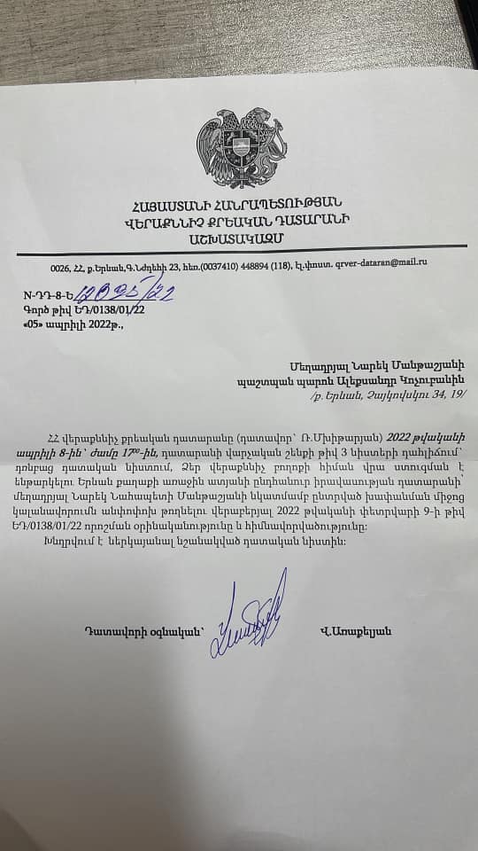 Հ․գ․ Այս դեպքով դիմելու ենք արդնախին և կարգապահական հանձնաժողովին։ Դատավորներին խնդրում եմ այս քայլին մոտենալ ըմբռնումով, ես մշտապես հակված եմ պահել գործընկերային հարաբերությունները և մշտապես աչք եմ փակում հետին թվով կազմված դատական ակտերի, դատավարական փաստաթղթերի, դրանք ուշ տրամադրելու և նմանատիպ այլ խախտումների վրա, բայց իրավական շանտղության դեմ գործընկերությամբ չես կարող պայքարել»։