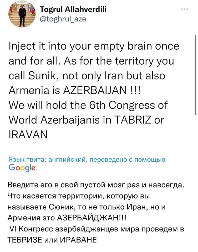 «Իրանը և Հայաստանը հանդիսանում են Ադրբեջանի տարածքի մաս»․ «Համաշխարհային ադրբեջանական կոնգրես» կազմակերպության մամլո խոսնակ
