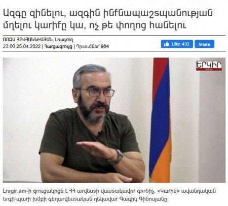 Գինոսյանը զենք ա բաժանո՞ւմ՝ չգիտեի: Զենքը պետության ձեռքում ա, որն էլ իր հերթին Նիկոլի ու նրա ուսապարկերի ձեռքում ա: Եթե ավելի իրատես լինենք՝ պետությունը, Նիկոլի ու նրա ուսապարկերի ջանքերով, Էրդողանի ու Ալևի ձեռքում ա: Այ պետությունը նրանցից ետ վերցնելու, պետության զենքը ժողովրդին տալու և զինված ժողովրդին ինքնապաշտպանության մղելու համար հիմա պետք ա ժողովրդին փողոց հանել: