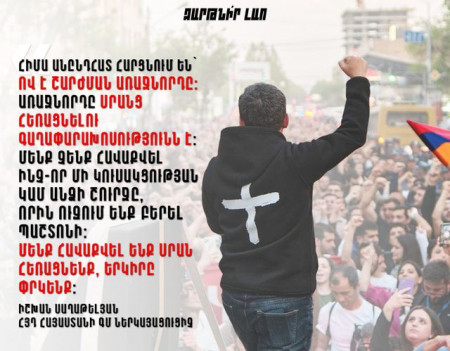 Հիմա անընդհատ հարցնում են՝ ո՞վ է շարժման առաջնորդը։ Առաջնորդը սրանց հեռացնելու գաղափարախոսությունն է։ Այսինքն, Հայրենիքը փրկելու գաղափարն է առաջնորդողը։