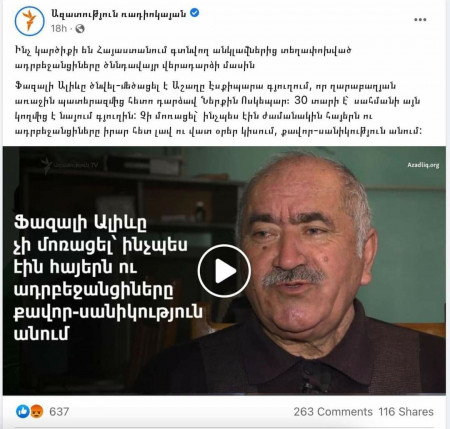 Այդ լրատվամիջոցներից հակահայկական իր քարոզով առաջին հորիզոնականում է «Ազատություն» ռադիոկայանը: Երեկվա իրենց հրապարակած հերթական մի տեսանյութը Տավուշի իբր ադրբեջանական հողերի մասին այդպիսի քարոզի վառ օրինակ է (տես կից նկարը):