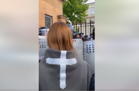 Պատգամավոր Աննա Գրիգորյանը Արցախի դրոշ է կպցնում ոստիկանական վահանի վրա. Տեսանյութ