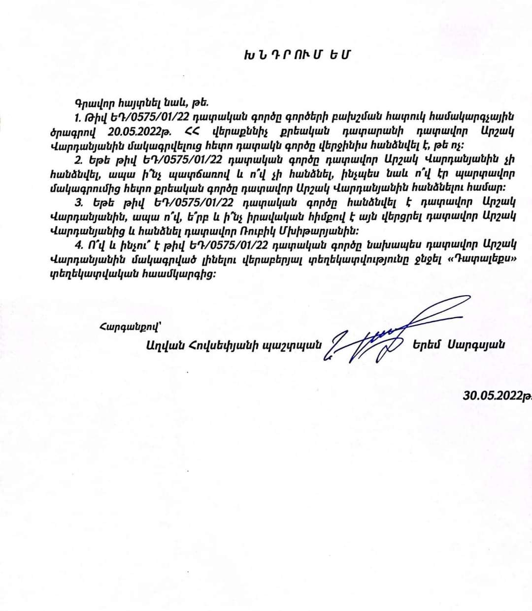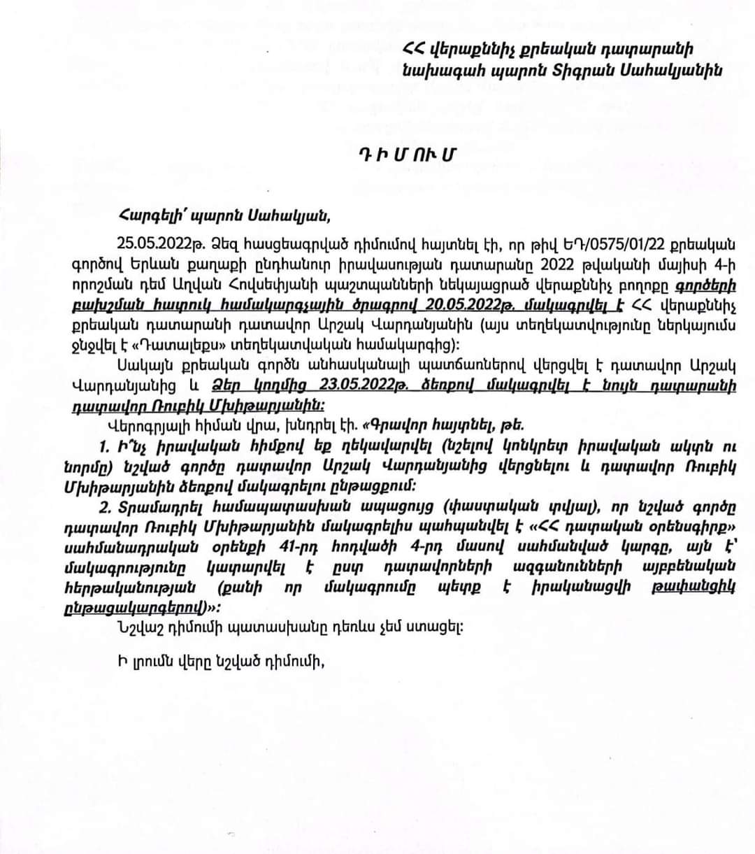 Փաստաբան Երեմ Սարգսյանը ֆեյսբուքյան իր էջում գրել է․ «Աղվան Հովսեփյանին ապօրինի կալանքի տակ պահելու ցանկությունն այնքան մեծ է, որ վերաքննիչ բողոքի քննությունը ցանկալի դատավորին հանձնելու համար իրավասու պաշտոնյանները պատրաստ են ցանկացած ապօրինության։