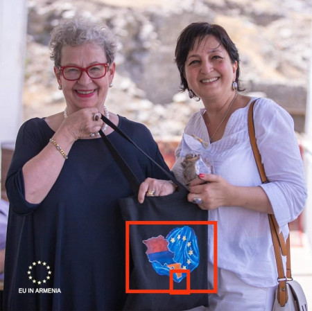 Հայաստանում ԵՄ դեսպանն այցելել է Մեղրի, որտեղ ցուցադրում է Հարավային Կովկասի պատկերով մի պայուսակ, որի վրա Հայաստանը պատկերված է առանց Արցախի ու Մեղրիի