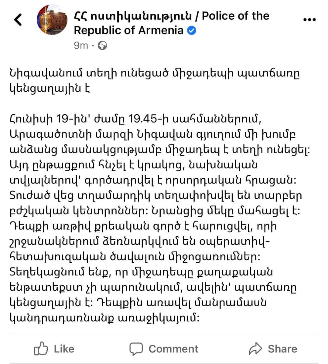 Ոստիկանությունը շտապեց արձագանքել ՔՊ-ականների բարեկամների կողմից Ապարանում կատարած սպանությանը: