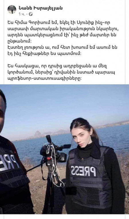 Էս չլրագրողուհին (սրա նմանին լրագրող ամոթելա ասելը) նկար է հրապարակել Տավուշի մարզի Բերքաբերի (Ջողազ) ջրամբարի մոտից ու գրել է որ հիմա Գորիսում է։ Այ ես կարգի անգրագետա։ Միհատ էլ ասումա կռիվ չկա, ամբողջը հեքիաթա։ Սրան մեկը տանի կորցրած դիրքերը ու այդքան զոհերը ցույց տա, տեսնես էլի էշ էշ դուս կտա հանուն մի երկու կոպեկի։