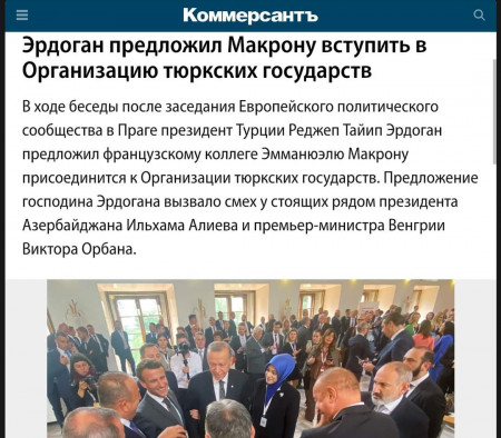 Էրդողանը հերթական անգամ ծաղրում է Մակրոնին, մի օր էլ վզին ճլոթի է տալու... Իսկ Հայաստանում գառի ուղեղով ոչխարներ կան, որ երգում են, թե Մակրոնը հեռախոսով մեր անվտանգությունը կապահովի։