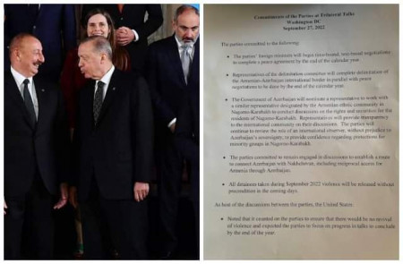 Ա՛յ ընկերներ․ Սեպտեմբերի 27-ին, Վաշինգտոնում, ՀՀ ԱԽ քարտուղար Արմեն Գրիգորյանը և Ալիևի օգնական Հիքմեթ Հաջիևը հանդիպել և արդյունքում «ստացել» են մի փաստաթուղթ, որը այնուհետ Պրահայում դրվել է Փաշինյան-Ալիև բանակցությունների սեղանին։ Չե՞ք տեսել, դե նայեք։ Երեկ արտահոսքի արդյունքում բացահայտվել է այդ փաստաթուղթը։ Դատելով նրանից, որ այն լայնորեն տարածվել է, բայց չկա որևէ հերքում, ստացվում է որ, այդ թուղթը խիստ հավաստի է։