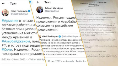 Առավոտ Նիկոլ Փաշինյանը գրում է, թե սեպտեմբերին դեռ ընդունել է ռուսական առաջարկները և հուսով է՝ Ռուսաստանը կպաշտպանի իր առաջարկները, Ադրբեջանին էլ կստիպի համաձայնի։ Համարյա նույն բանը գրում է Նիկոլի մոտ աշխատող, հատուկ հանձնարարություններով դեսպան Էդմոն Մարուքյանը։