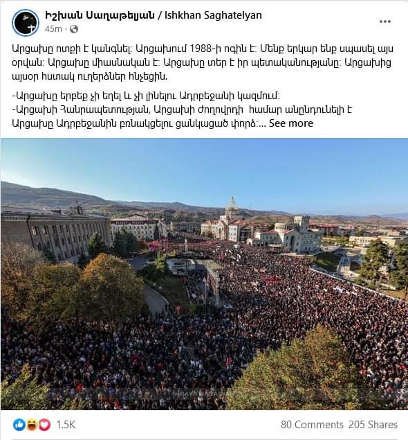Որ ասում եմ՝ նիկոլական քարոզչամեքենան հիստերիայի մեջ է, խնդրեմ, վառ օրինակ. Իշխան Սաղաթելյանը գրել է Ստեփանակերտի ցույցի մասին ու որ նոյեմբերի 5-ին Երևանում էլ է ցույց լինելու... Գրառման տակ՝ 600 ծաղրական զմայլիկ («հա-հա»)... Բացեցի տեսնեմ, թե ովքեր են։