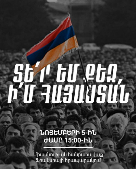 «Հայաստան» դաշինքը ֆեյսբուքյան եւ տելեգրամյան էջերում հրապարակել է կարգախոսներ, որոնցով կոչ է անում քաղաքացիներին՝ նոյեմբերի 5-ին, ժամը 15։00-ին մասնակցել Ֆրանսիայի հրապարակում կայանալիք միասնության հանրահավաքին։