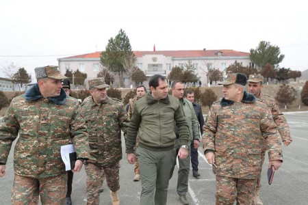 Պաշտպանության նախարարի «համազգեստը» մի կողմ, լուսանկարի առաջին պլանում երեք զինվորական են՝ ներառյալ ԶՈՒ Գլխավոր շտաբի պետը։