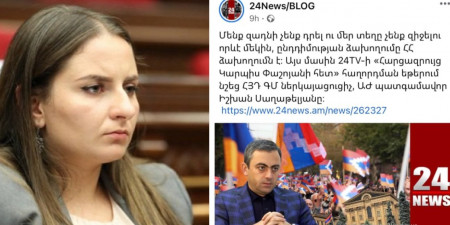 «Սոցիալական ցանցերում «Մեր տեղը չենք զիջելու որևէ մեկին» նկարագրությամբ տարածվող նյութը արդյունք է դեկտեմբերի 5-ին «24News» տաղավարում ՀՅԴ Հայաստանի Գերագույն մարմնի ներկայացուցիչ, ՀՀ ԱԺ «Հայաստան» խմբակցության պատգամավոր Իշխան Սաղաթելյանի հնչեցրած տեսակետների կամայական ու համատեքստից անջատված մեկնաբանության. հարցազրույցի ընթացքում նման տեսակետ չի հնչել: