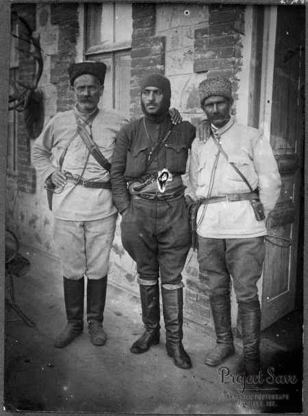 Ձախից առաջինը՝ Դաշնակցական Քաչալ Ղազար, կենտրոնում՝ Գարեգին Նժդեհը, կողքինը՝ անհայտ է։