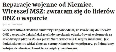 • Նախօրեին հայտնի դարձավ, որ Լեհաստանը, մերժում ստանալով Գերմանիայից՝ քննարկելու 1.3 տրիլիոն դոլար ռազմատուգանքի հարցը, դիմելու է ՄԱԿ-ին, որ վերջինս միջամտի այդ հարցին (https://www.polskieradio.pl/399/7980/Artykul/3097201,Reparacje-wojenne-od-Niemiec-Wiceszef-MSZ-zwracam-sie-do-liderow-ONZ-o-wsparcie): Պարզ ասած՝ Լեհաստանը հաշիվ է պահանջում երկրորդ աշխարհամարտի ժամանակ Գերմանիայի պատճառած վնասի համար։ Նույնն է լինելու նաև Ադրբեջանի ու Հայաստանի միջև։ Ասեմ ինչու։