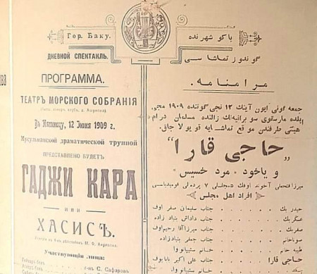 Ստորև 1909թ.-ին Բաքվում տեղի ունեցած «Հաջի Ղարա» թատերական ներկայացման երկլեզու ազդագիրն է, որում սևով սպիտակի վրա երկու լեզուներով էլ գրված է, որ ներկայացումը խաղալու է «մուսուլմանական դրամատիկական թատերախումբը»։