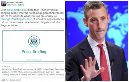 Ադրբեջանի Արտաքին գործերի նախարարության մամուլի խոսնակ Այխան Հաջիզադեն պատասխանել է ԱՄՆ Պետական դեպարտամենտի ներկայացուցիչ Նեդ Փրայսի այն հայտարարությանը, որ անհրաժեշտ է ապաշրջափակել Լաչինի միջանցքը։