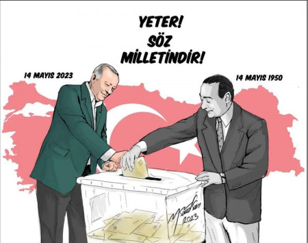 Հ.Գ. Լուսանկարը նույնպես սիմվոլիզմի գերխտացում է. պատկերված են Թուրքիայի նախկին վարչապետ Ադնան Մենդերեսը և գործող նախագահ Էրդողանը՝ իրար հետ նույն քվեատուփի առջև սիմվոլիկ 1950 և 2023 թվականների մայիսի 14-երին: