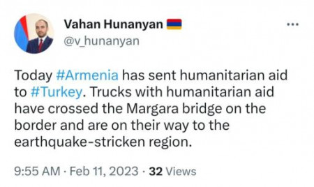 Հումանիտար օգնությամբ բեռնված բեռնատարներն անցել են սահմանը Մարգարայի կամրջով և ուղևորվել դեպի երկրաշարժից տուժած շրջան։