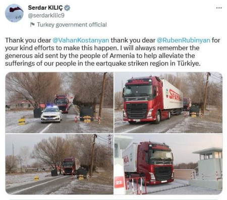 Թուրքիա օգնություն ուղարկելուն ի պատասխան հայ-թուրքական կարգավորման հարցերով Անկարայի հատուկ ներկայացուցիչը՝ թուրք դիվանագետ Սերդար Քիլիչը, Թվիթերում շնորհակալություն է հայտնել, ինչը մեծ ոգևորություն է առաջացրել հայրենակիցներիցս ոմանց մոտ։