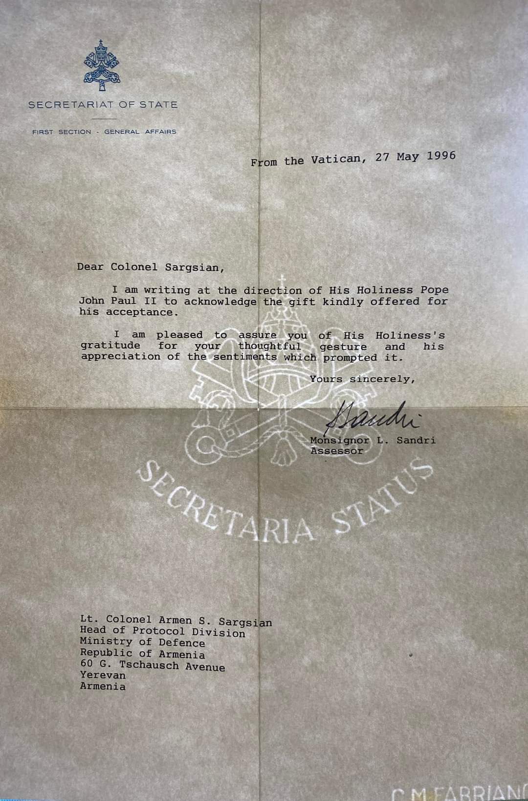 «Վազգենը Սարգսյանը հա՛մ զայրացած էր, հա՛մ հպարտ: Զայրացած էր, քանի որ իր վարչության պետերից մեկն՝ առանց իրեն տեղեկացնելու, ինքնագլուխ գնացել ու ընդունելության էր արժանացել ոչ ավել, ոչ պակաս Հռոմի Պապ Հովհաննես Պողոս երկրորդի մոտ: Հպարտ էր, քանի որ իր վարչության պետերից մեկն ինքնագլուխ կարողացել էր հանդիպել Հռոմի Պապի հետ, զրուցել նրա հետ, հայկական կոնյակ նվիրել և ամենայն հավանականությամբ այն ըմբոշխնելուց հետո Հռոմի Պապը շնորհակալական նամակ էր ուղարկել Արմեն Սարգսյանին՝ Էջմիածնի միջոցով: Վազգենից նեղացել էր նաև Վեհափառը՝ «մի կես բերան գոնե տեղեկացնեիք, որ նման հանդիպում եք կազմակերպում» տրամաբանության մեջ: Չէին հավատում, որ առանց նախապես կազմակերպելու մի հայ փոխգնդապետ կարող էր արժանանալ նման բարձր ընդունելության: