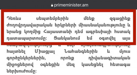 Իսկ հիմա նրա կայքում հայտվել է սույն թսիկությունը. «Հայաստանի Հանրապետությունը ձեռնպահ է մնում հետեւյալ պարբերությունից… քանի որ սույն պարբերությունը համապարփակ եւ ընդգրկուն կերպով չի արտացոլում բոլոր հակամարտությունները եւ ճգնաժամերը եւ չի անդրադառնում Հայաստանի Հանրապետության ինքնիշխան տարածքի դեմ Ադրբեջանի ագրեսիայի դրսեւորման եւ Հայաստանի ինքնիշխան տարածքի որոշակի հատվածների օկուպացման փաստին»։
