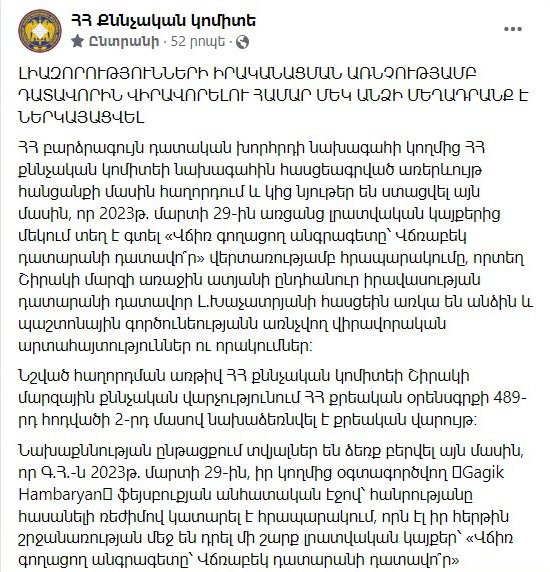 Ստորև՝ ՀՀ Քննչական կոմիտեի հաղորդագրությունը.