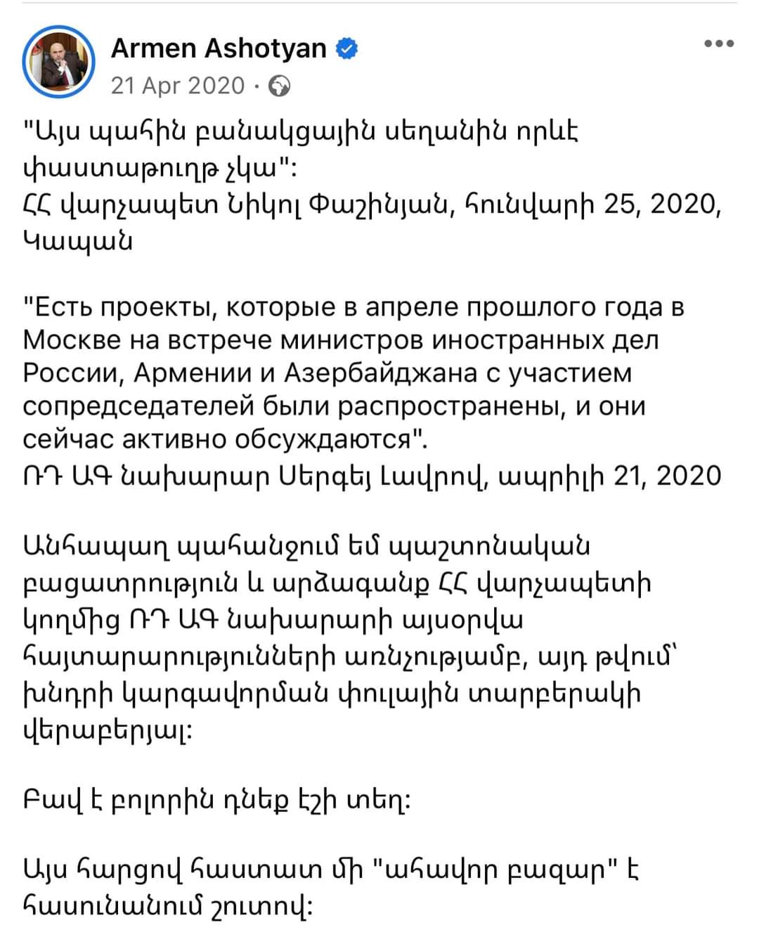 Արմեն Աշոտյանի ֆեյսբուքյան էջից