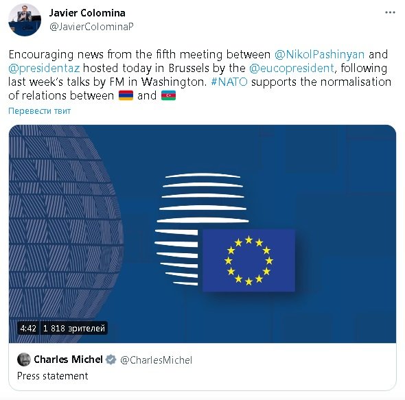 Ոգևորիչ նորություններ հինգերորդ հանդիպումից: Այս մասին իր թվիթերյան էջում գրել է ՆԱՏՕ-ի գլխավոր քարտուղարի՝ Հյուսիսային Կովկասի և Կենտրանական Ասիայի հարցերով խորհրդական Խավյեր Կոլոմինան՝ անդրադառնլաով այսօր Բրյուսելում կայացած Փաշինյան-Միշել-Ալիև եռակողմ հանդիպմանը։