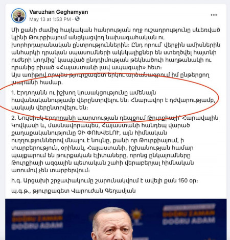 Ավելին ասեմ, միջնաժամկետ ու երկարաժամկետ տեսանկյունից Էրդողանի՝ իշխանության մնալը կարող է հավելյալ ճգնաժամ հարուցել թուրքական պետության համար որոշ ժամանակ անց, ինչը մեզ համար փոքրիկ հնարավորությունների պատուհան կարող է բացել։ Բայց այդ մասին՝ մեկ այլ առիթով։