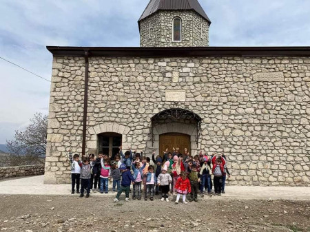 Նկարում Արցախի Շոշ գյուղի խոխեքն են Շոշի Սուրբ Աստվածածին եկեղեցու բակում՝ թշնամուց ընդամենը 200-300 մետր հեռու։