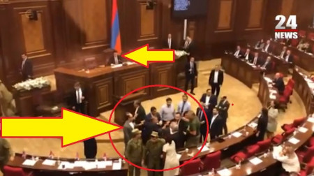 «Չհամարձակվե՛ս ՀՀ ԱԺ նախագահի հետ «դու»-ով խոսել»,- ասաց Ալեն Սիմոնյանը՝ դիմելով Մինասյանին: «Դու ԱԺ նախագահ չես»,- ասաց նա: «Բա դու ո՞վ ես, եթե ես ԱԺ նախագահ չեմ, դու ի՞նչ ես անում ստեղ»,- արձագանքեց Սիմոնյանը: Ելույթի համար ամբիոնին մոտեցավ ՔՊ-ական Հայկ Կոնջորյանը. դիմելով դահլիճից արձագանքող Սեյրան Օհանյանին, ասաց. «Ձեզ կոռեկտ պահեք, Դուք դաստիարակություն ստացե՞լ եք: Մեծ մասը չլսեց՝ ինչ ասացիք ԱԺ նախագահին. հիմա ես Ձեզ ասում եմ՝ սրիկան դուք եք»: