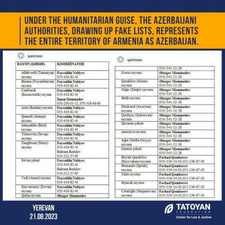 Այդ ցուցակներում Հայաստանի քաղաքների ու գյուղերի անվանումները ներկայացված են ադրբեջանական կեղծ անվանումներով։