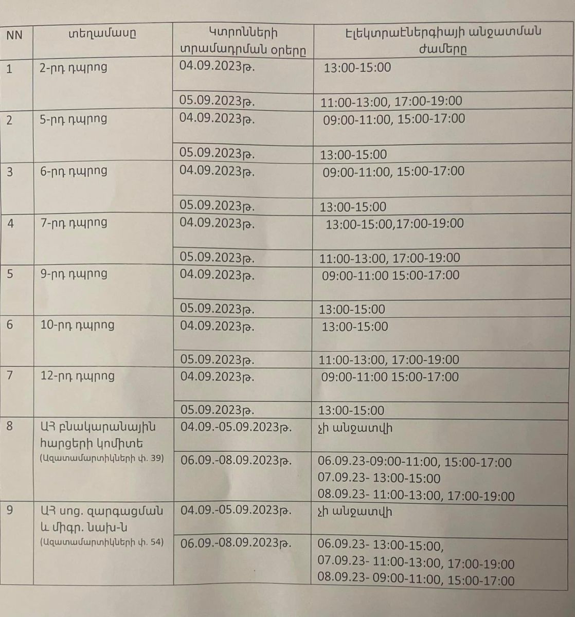 Կտրոնների տրամադրման տեղամասերը, կտրոնների տրամադրման օրերը և այդ օրերին էլեկտրաէներգիայի անջատման ժամերը ներկայացված են ստորև։ Քանի որ կտրոնները համարակալված են, սոցիալական զարգացման և միգրացիայի նախարարության կողմից յուրաքանչյուր օր կիրականացվի իրազեկում, թե տվյալ և հաջորդ օրը որ համարի կտրոնով է իրականացվելու հացի վաճառքը։