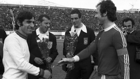 Լուսանկարում՝ «Արարատի» լեգենդար ավագ, երջանկահիշատակ Հովհաննես Զանազանյանը և «Բավարիայի» ավագ Ֆրանց Բեկենբաուերը՝ 1975 թվականի երևանյան հանդիպման մեկնարկային ողջույնի ժամանակ: