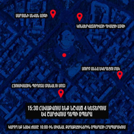 ժամը 15:30 հավաքվում ենք հետևյալ չորս կետերում և շարժվում դեպի Օպերա, դրսևորելու մեր քաղաքացիական խաղաղ անհամաձայնությունը.