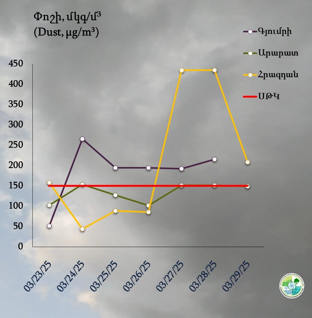 Հիդրոօդերևութաբանության և մոնիթորինգի կենտրոնը ներկայացրել է Հայաստանի քաղաքների մթնոլորտային օդում փոշու պարունակության մասին տվյալներ՝ մարտի 23-29-ն ընկած ժամանակահատվածի համար։
