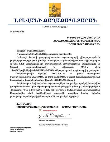 Երևանի ավագանու «Մայր Հայաստան» խմբակցության անդամ Մեսրոպ Մանուկյանը ֆեյսբուքյան էջում գրում է. «Թե բա գումար չենք փոխանցել, ակտերն էլ չենք ստորագրել...
