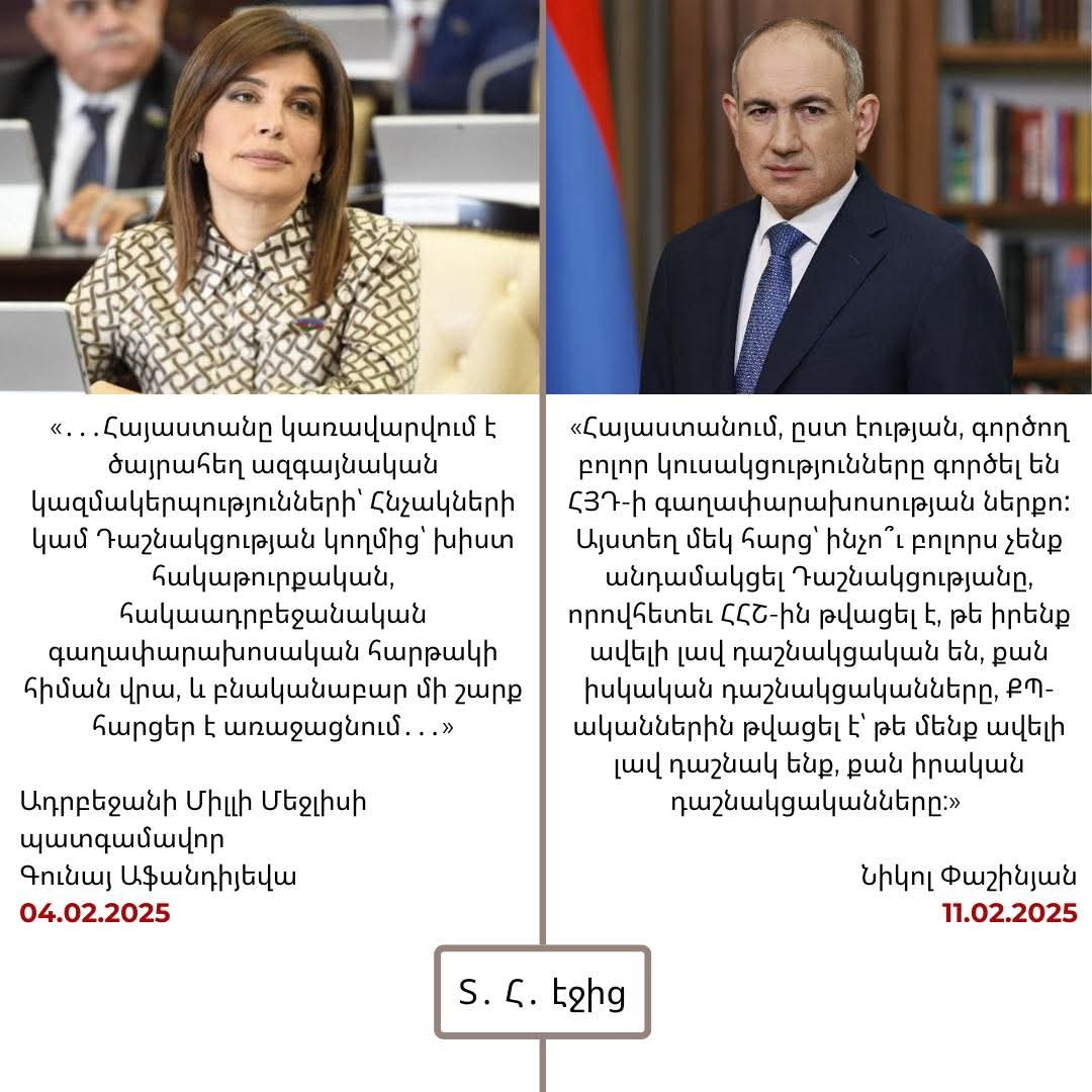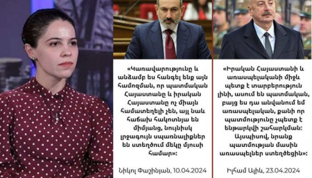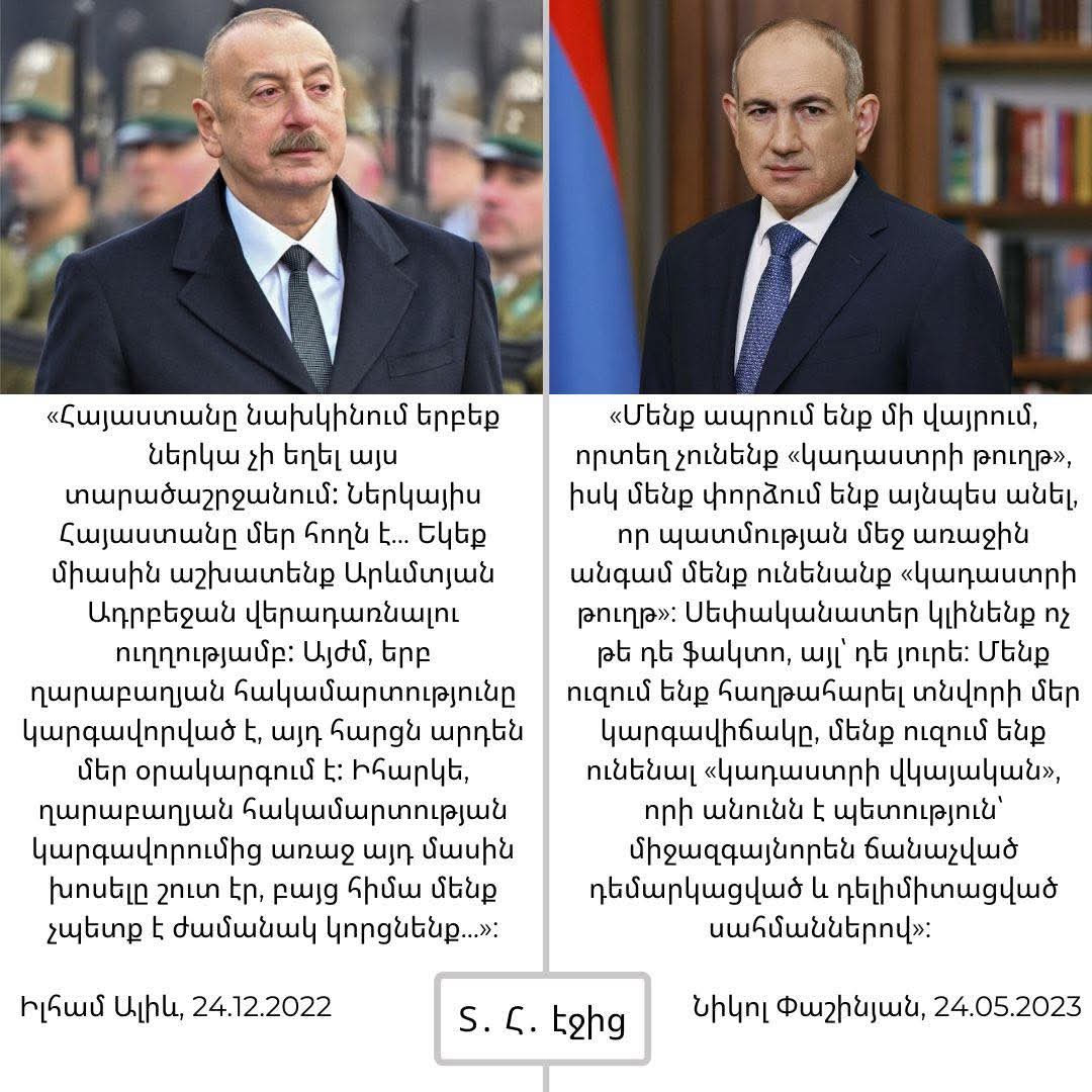 Ես էլ դա փաստերով ցույց եմ տալիս ընդամենը։ Իսկ առհասարակ Բաքվի ղեկավարության կողմից հնչեցված թեզերն այնքան նույնական են Փաշինյանի ասածների հետ, որ կարող եմ արդեն առանձին ֆոտոալբոմ սարքել այդ թեմայով։ Դեռ ես շատ փոքր մասն եմ տեղադրում․․․Դատողություններն էլ թողնում եմ ընթերցողներին»։