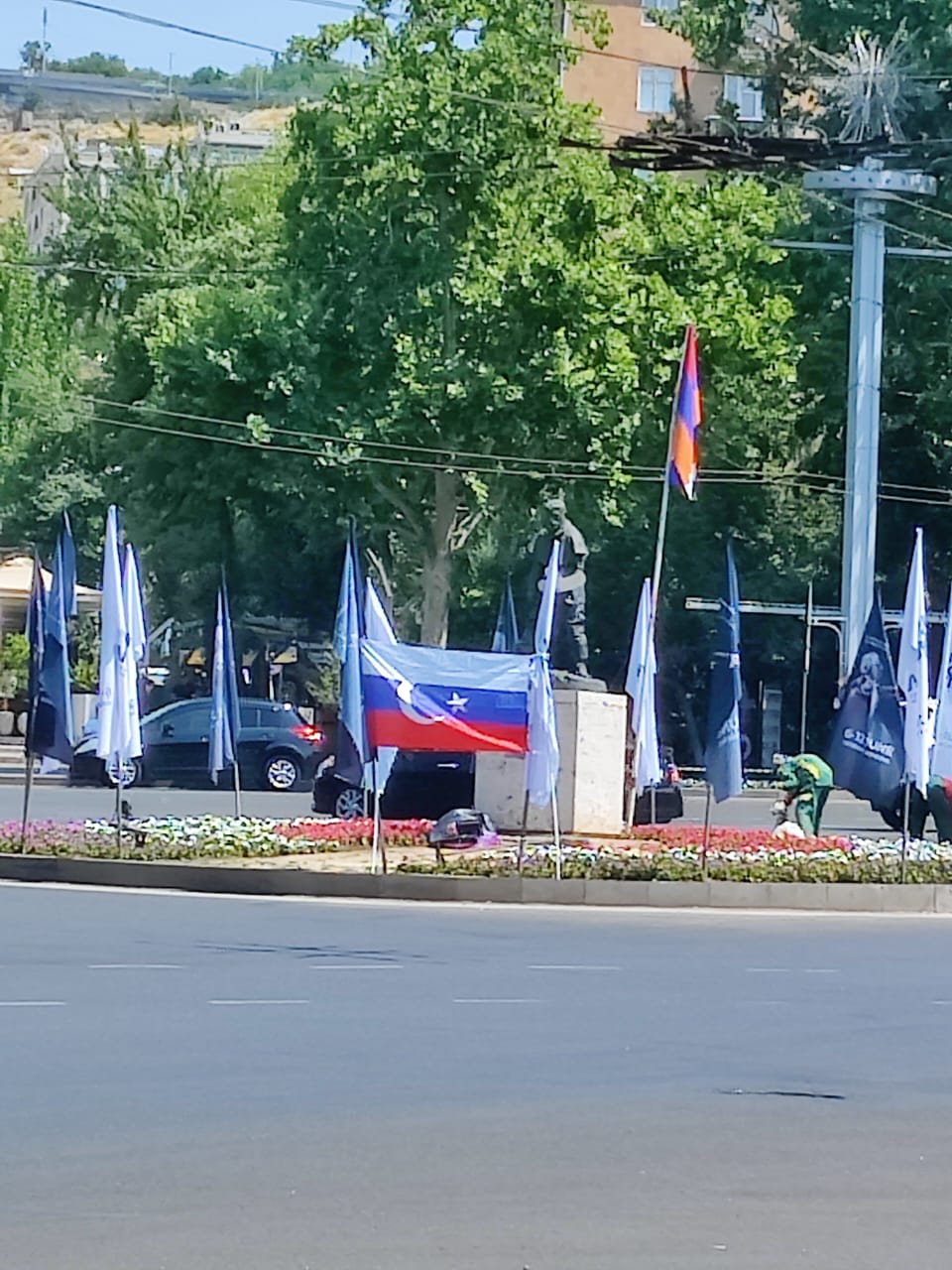 Երևանի Ֆրանսիայի հրապարակի կենտրոնում, շրջանաձև անցման ծաղկապատված հատվածում ինչ-որ անձինք տնկել են Ռուսաստանի դրոշը՝ վրան թուրքական դրոշի կիսալուսնի ու աստղի նշանով: Խոսքն այն հատվածի մասին է, որտեղ 2022 թվականի գարնանից կենտրոնում զետեղված է Արցախի դրոշը: