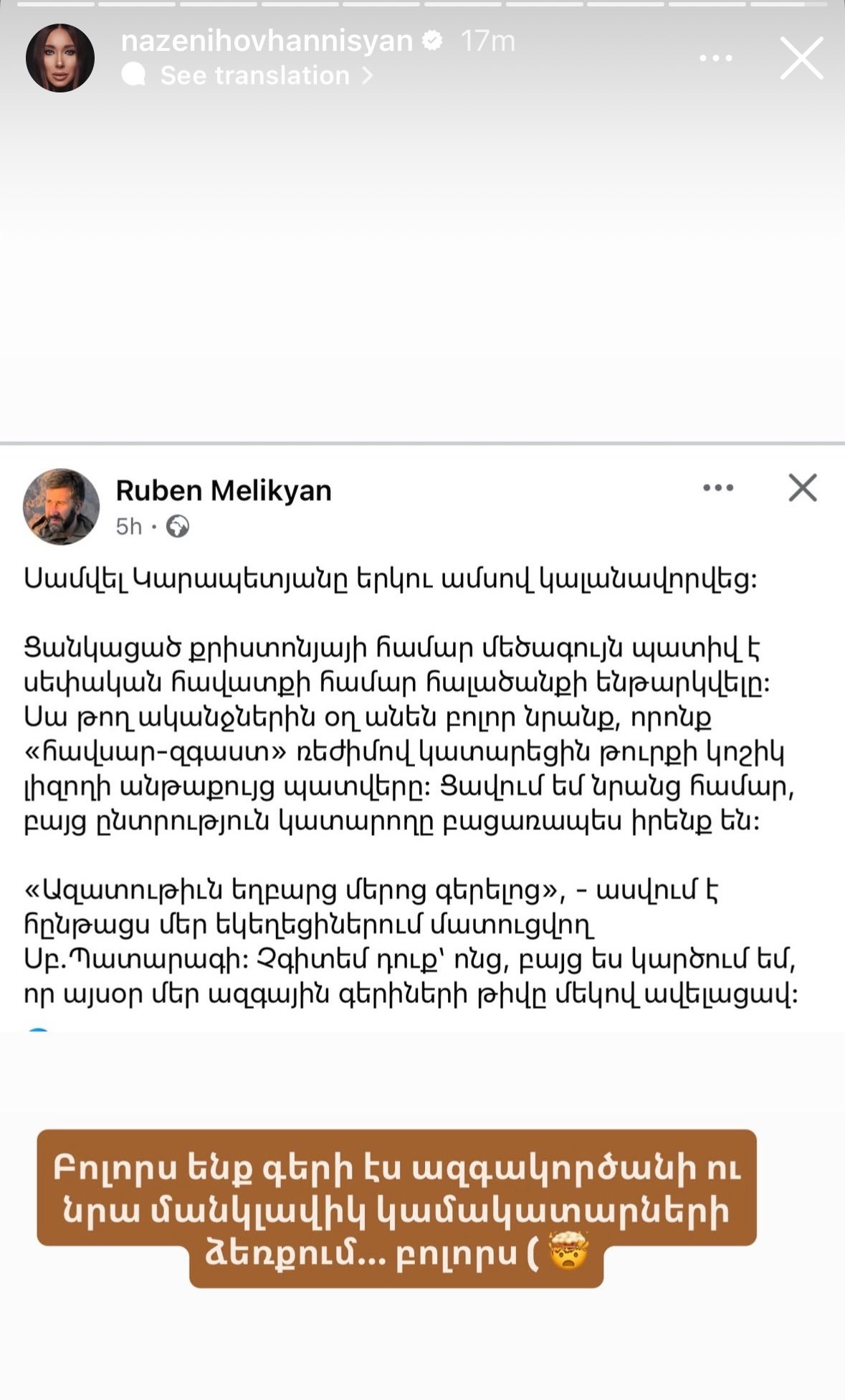 Դերասանուհի, հաղորդավարուհի Նազենի Հովհաննիսյանն ինստագրամյան իր էջի «սթորի» բաժնում անդրադարձել է Սամվել Կարապեյանի կալանավորմանը: Նա կիսվել է Ռուբեն Մելիքյանի գրառմամբ, որին հավելել է՝ «Բոլորս ենք գերի էս ազգակործանի ու նրա մանկլավիկ կամակատարների ձեռքում…բոլորս»: