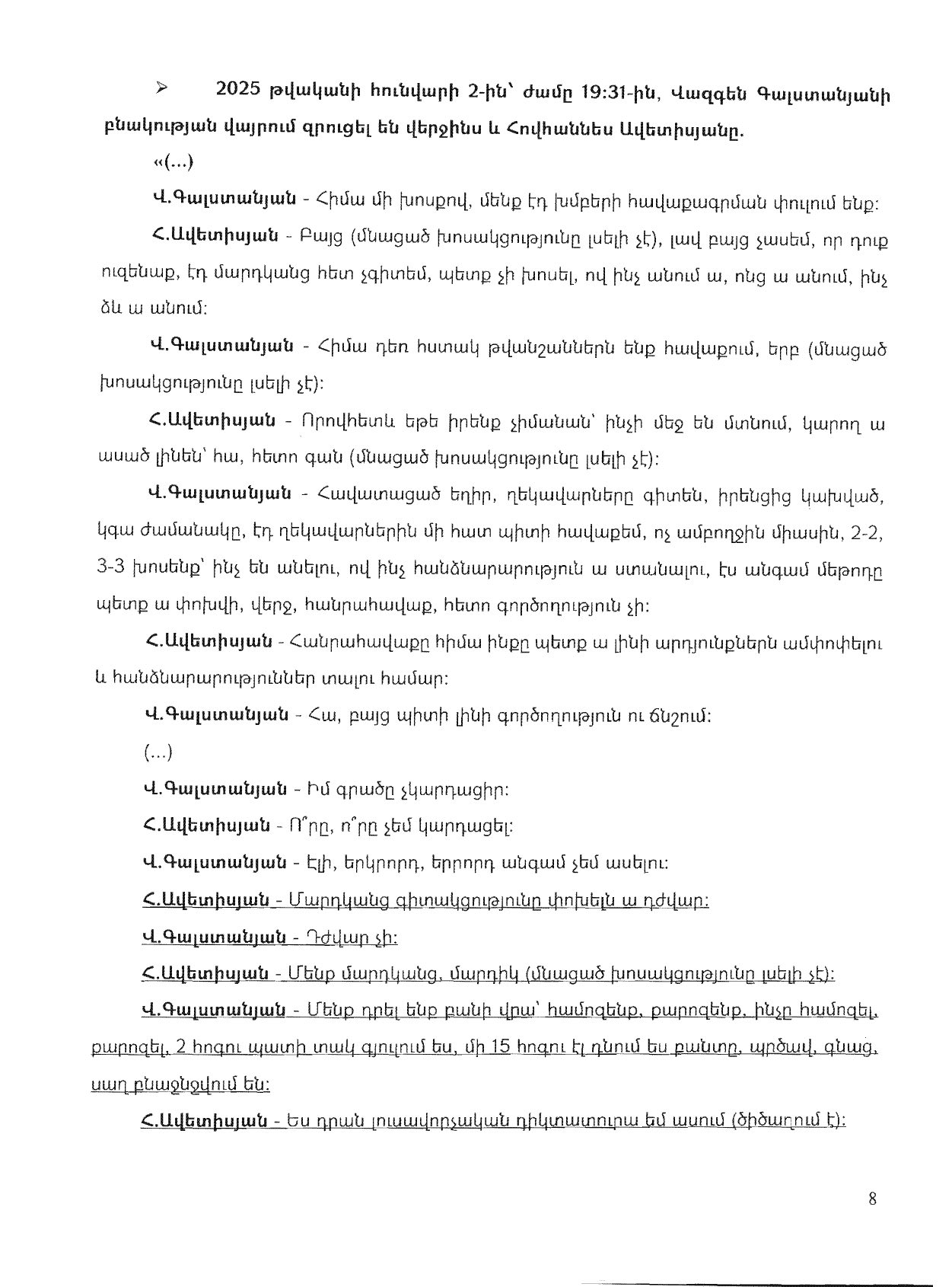 - ձայնագրության վերաբերելի հատվածը ամբողջությամբ (սեղմել գաղտնալսողի նկարի վրա) , որը տրամադրվել է նախաքննության ավարտին: Ըստ իրավապահ և ոչ իրավապահ քարոզիչների «գյուլլելը» վերաբերելի էր գործող իշխանությունների ներկայացուցիչներին, բայց լսեք ձայնագրությունը ամբողջությամբ ու ինքներդ որոշեք, թե ինչի մասին է խոսակցությունը:
