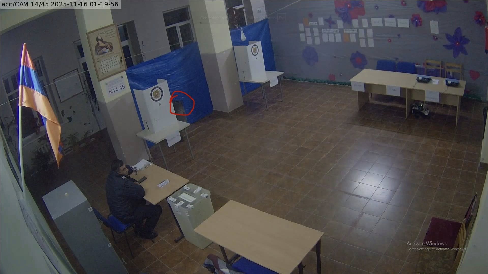 14/19 տեղամասային կենտրոնի քվեախցերի հետևի պատուհանները շատ կարճ են փակված սպիտակ թղթով: Դրսից հնարավոր է ծանոթանալ ընտրողի քվեարկությանը: