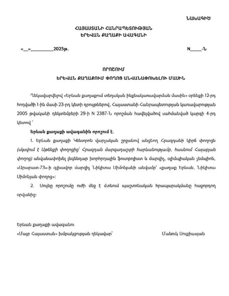 «Մայր Հայաստան» խմբակցության նախաձեռնությամբ շրջանառության մեջ դրեցինք «Հրազդան» մարզադաշտի հարեւանությամբ Հրազդանի կիրճ փողոցը Նիկիտա Սիմոնյանի անվան փողոց վերանվանելու նախագիծ։