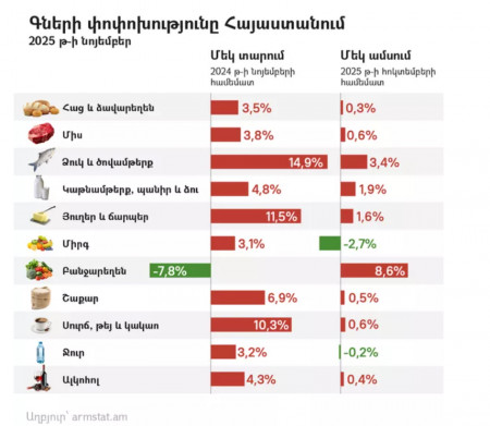 Ինչ վերաբերում է մսամթերքին, ապա թռչնամիսը այս տարվա նոյեմբերին 2024 թ. նոյեմբերի համեմատ թանկացել է 1.8%–ով, տավարի, խոզի և գառան միսը՝ 4.2%, 9.9% և 13.5%–ով:
